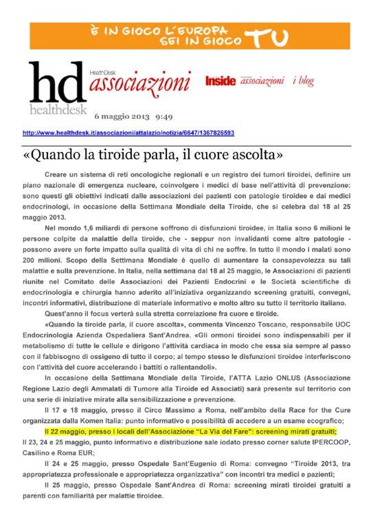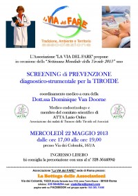 In occasione della “Settimana Mondiale della Tiroide 2013” il 22 maggio 2013 dalle ore 17,00 alle ore 19,00 presso la nostra sede Via dei Colombi, 163/A organizziamo uno SCREENING di PREVENZIONE diagnostico-strumentale per la tiroide. Il coordinamento medico è a cura della Dott.ssa Dominique Van Doorne, medico endocrinologo e membro del comitato scientifico di ATTA Lazio Onlus (Associazione dei malati di Tumore della Tiroide ed Associati).