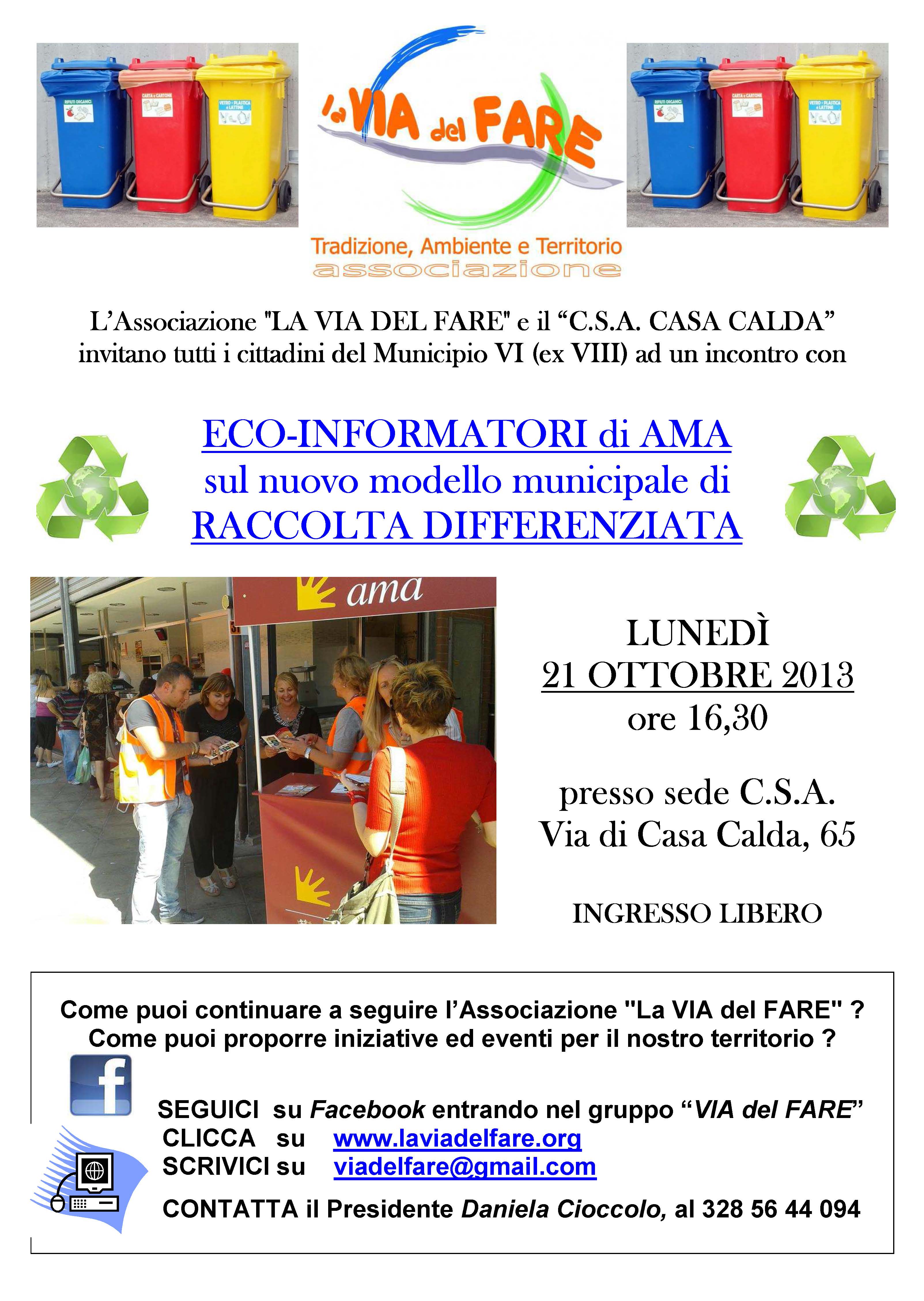 Lunedì 21 ottobre alle ore 16.30 presso la sede C.S.A. in via di Casa Calda 65 incontro con gli ecoinformatori di AMA per parlare della nuova raccolta differenziata in VI municipio.