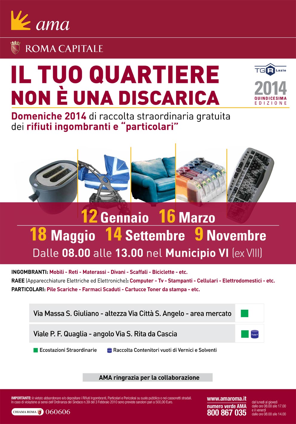 Riprende, in collaborazione con il TGR Lazio, l’iniziativa “Il tuo quartiere non è una discarica”, per incentivare la raccolta differenziata gratuita dei materiali ingombranti, elettrici, elettronici. Domenica 12 gennaio è il turno dei municipi pari. I punti di raccolta del nostro Municipio sono