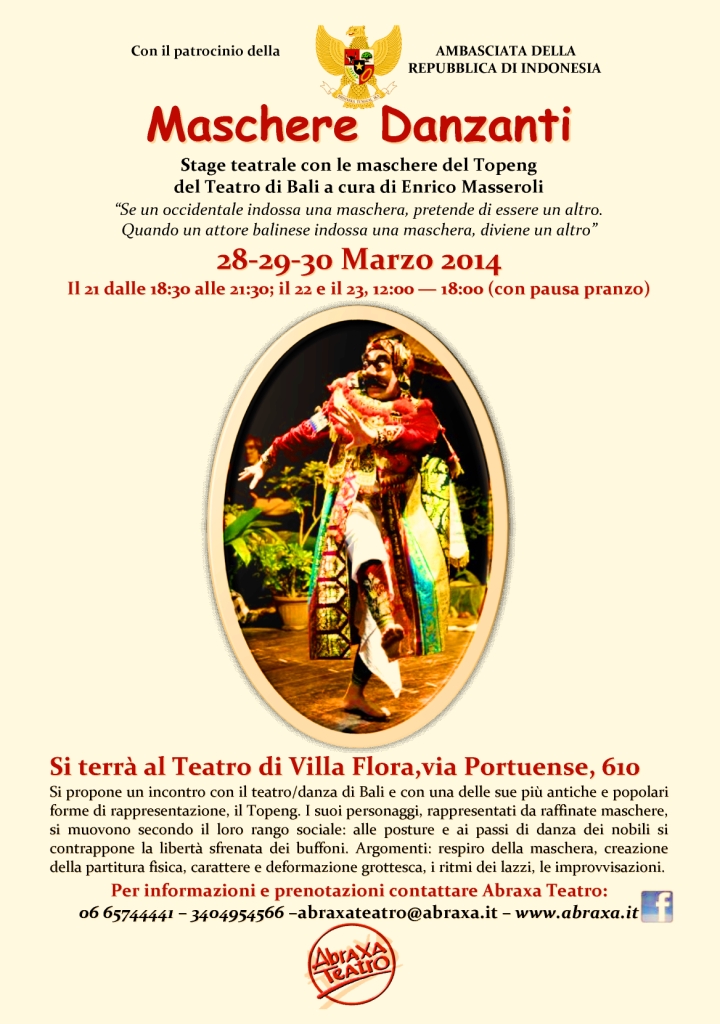 L’Ambasciata Indonesiana ha dato il suo patrocinio allo stage “Maschere Danzanti” per il suo alto valore artistico, condotto da Enrico Masseroli, massimo interprete italiano del teatro-danza balinese.
