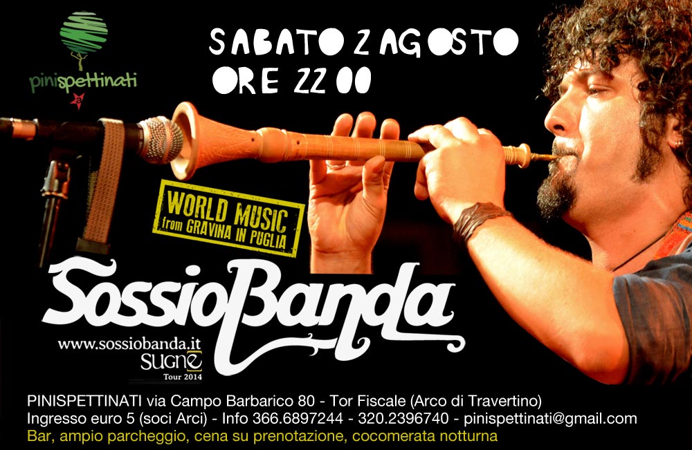 La Sossio Banda, da Gravina in Puglia, è una delle realtà più interessanti della World Music italiana. La loro musica parte da sonorità dell’Alta Murgia pugliese, terra d’origine del gruppo, contaminate da ritmi e influenze dell’area mediterranea attraverso l’utilizzo di strumenti tradizionali e contemporanei. Il repertorio comprende brani inediti e pezzi della tradizione pugliese rivisitati e riproposti in chiave World che danno alla banda un sound innovativo e ricco di contaminazioni, per uno spettacolo tutto da ballare. Il gruppo è composto da Francesco Sossio ai fiati, Loredana Savino alla voce, Pasquale Barberio, alla fisarmonica e Michele Marrulli alle percussioni.