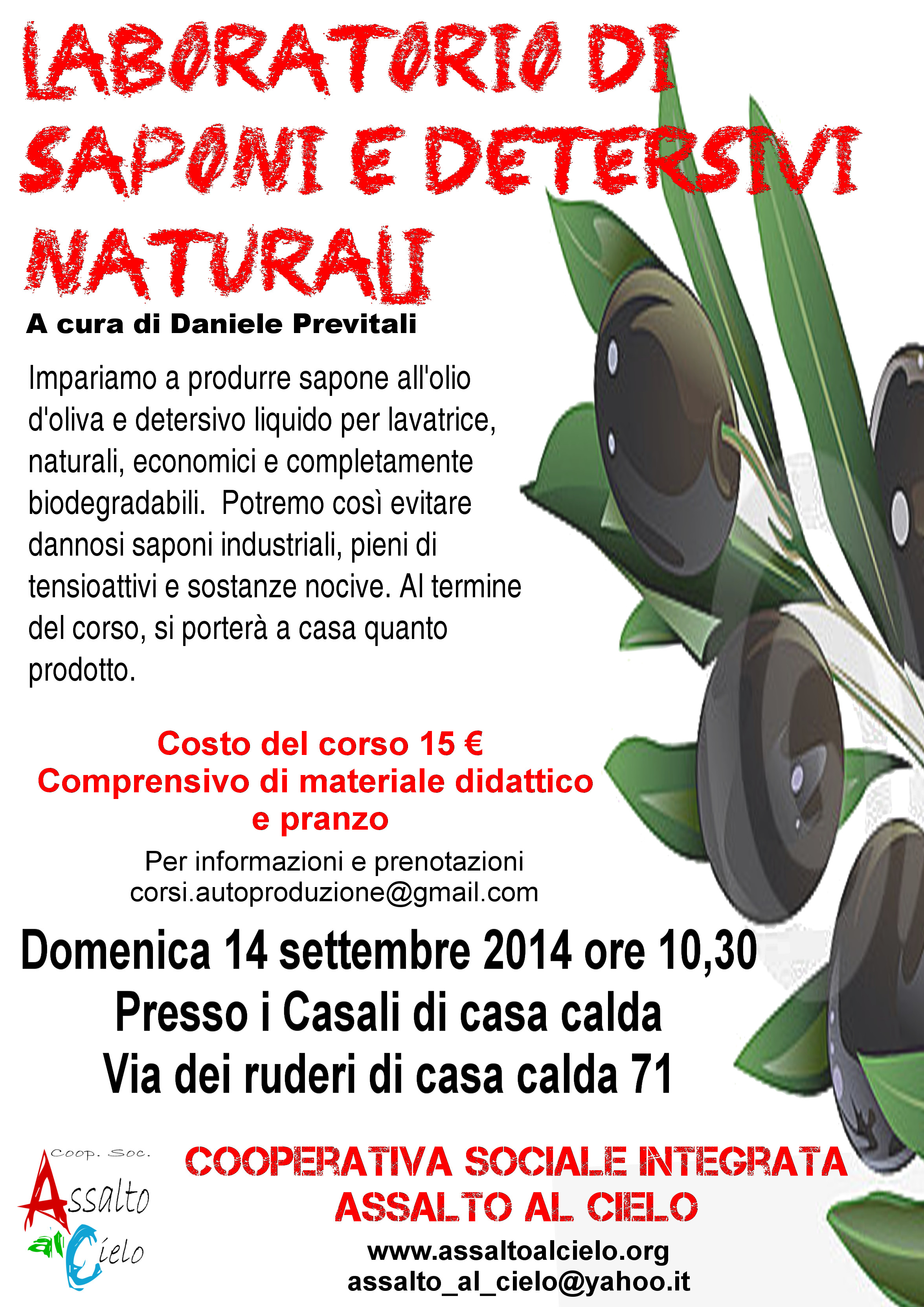 Domenica 14 settembre alle ore 10.30 presso i Casali di Casa calda impariamo a realizzare sapone all’olio d’oliva e detersivo liquido per lavatrice, in modo economico e completamente biodegradabili! Al termine del laboratorio portiamo a casa quanto realizzato. Il corso è comprensivo di materiale didattico ma è consigliato portare penna e