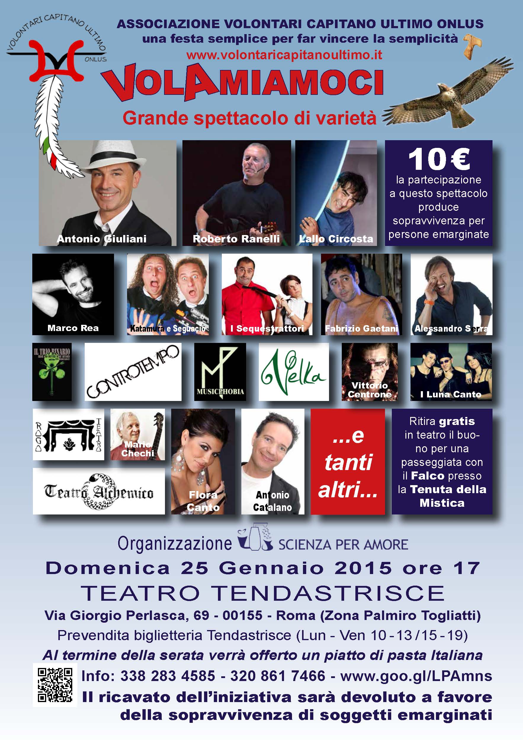 I nostri amici dell’Associazione Volontari Capitano Ultimo Onlus hanno voluto creare una giornata di festa per far vincere la semplicità il 25 gennaio 2015 alle ore 17.00 al Teatro Tendastrisce di Via Giorgio Perlasca 69, (zona Palmiro Togliatti angolo via Collatina), con un grande spettacolo di varietà “VOLAMIAMOCI” presentato da Flora Canto e il comico Antonio Catalano.