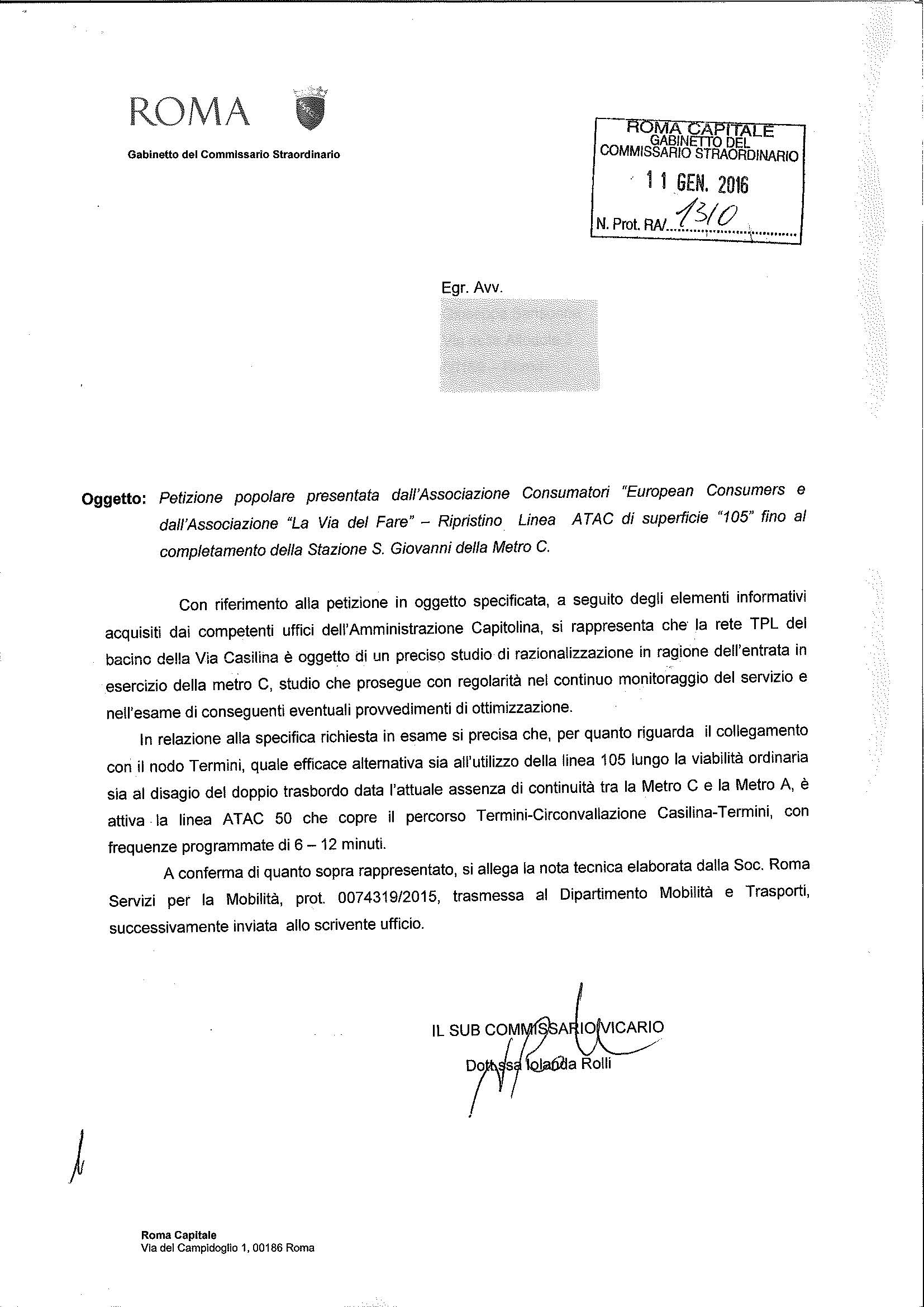 Dopo il rifiuto da parte del Municipio VI di farsi promotore per riattivare la Linea Bus 105 e la strategica fermata di Torre Maura, ci arriva ufficialmente il parere contrario del Prefetto Tronca alla petizione proposta dall’Ass.ne Consumatori “European Consumers” (pres. avv. Sansonna) e dall’Ass.ne “La Via del Fare” (vice pres. Gianfranco Gasparutto) e promossa attraverso una grande raccolta firme da tantissimi commercianti del nostro quartiere.