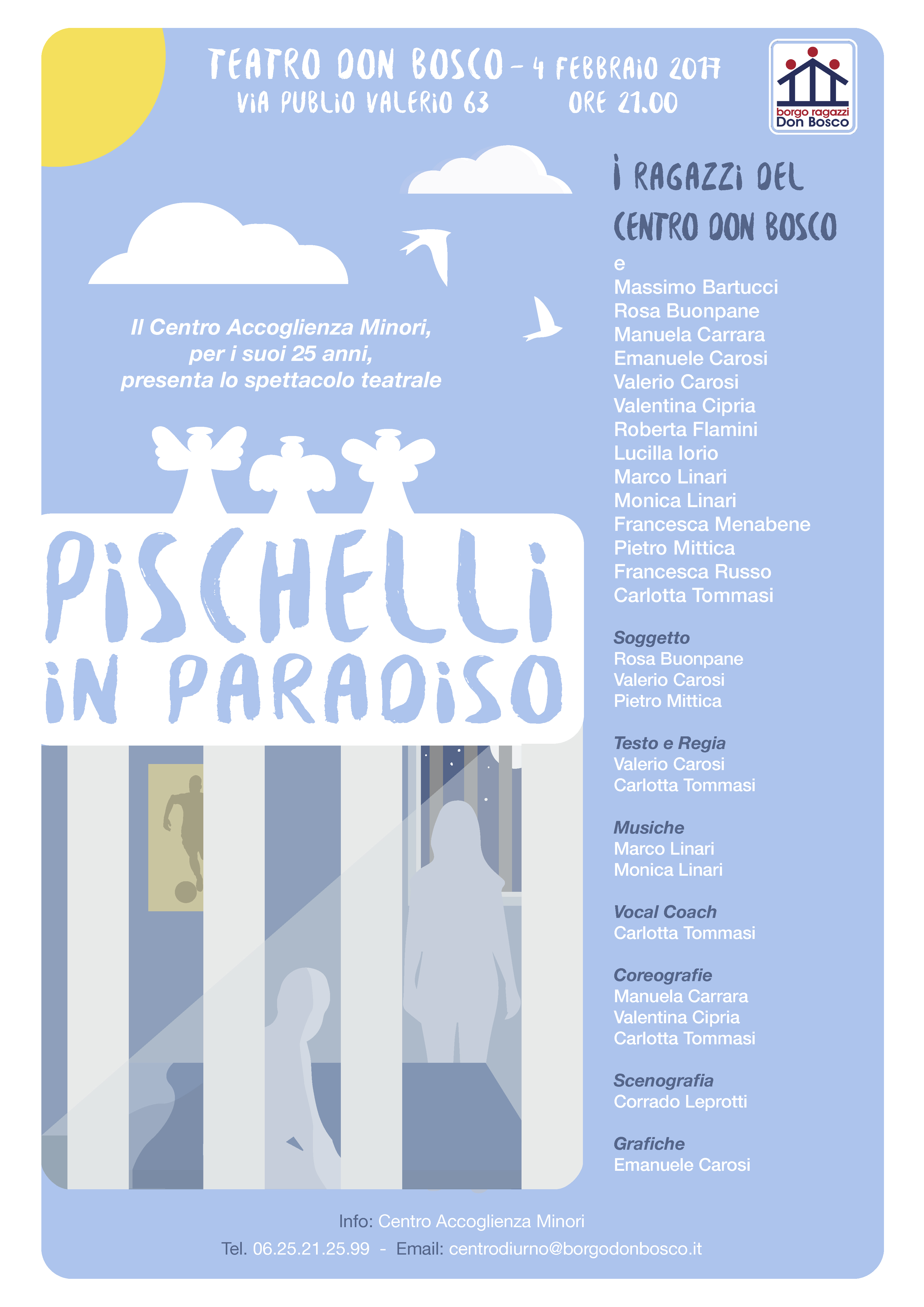 Quest’anno il Centro Accoglienza Minori del Borgo Ragazzi don Bosco compie 25 anni. Per l’occasione, operatori e ragazzi debuttano a teatro: tratto dal libro di don Alfonso Alfano, fondatore del Centro, lo spettacolo “Pischelli in Paradiso” racconta in modo divertente la vita dei ragazzi accolti in questi anni, passando dalla strada, al carcere, alla voglia di sognare.