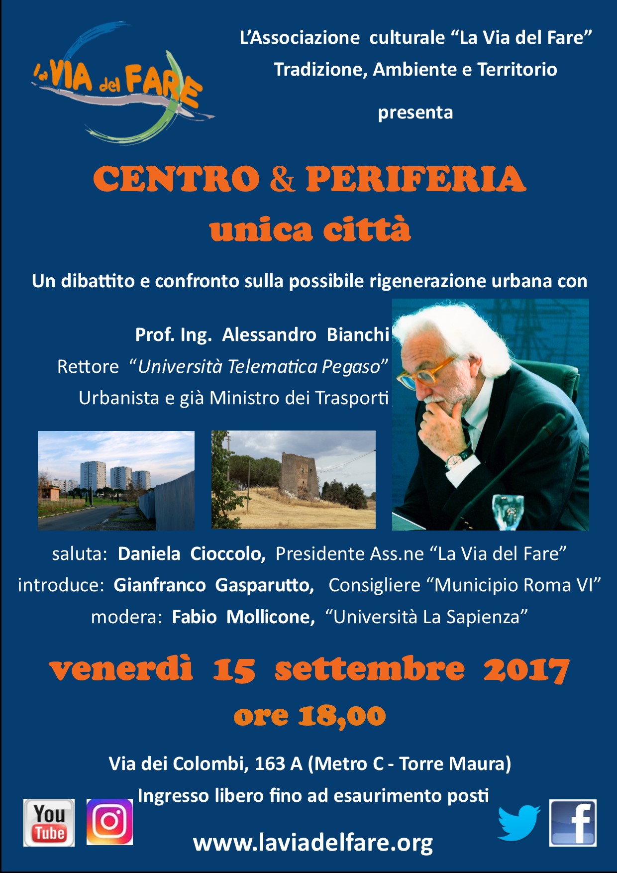 “CENTRO E PERIFERIE: UNICA CITTÀ”, questo è il tema della “Roma del Futuro” e questo è il tema dell’incontro del prossimo 15 Settembre 2017 alle ore 18, che “La Via del Fare” propone nella sua sede di Via dei Colombi 163, ai cittadini del quartiere di Torre Maura (Municipio Roma VI) ed ai tanti amici che seguono da ogni parte della città le numerose iniziative che da anni l’Associazione propone.