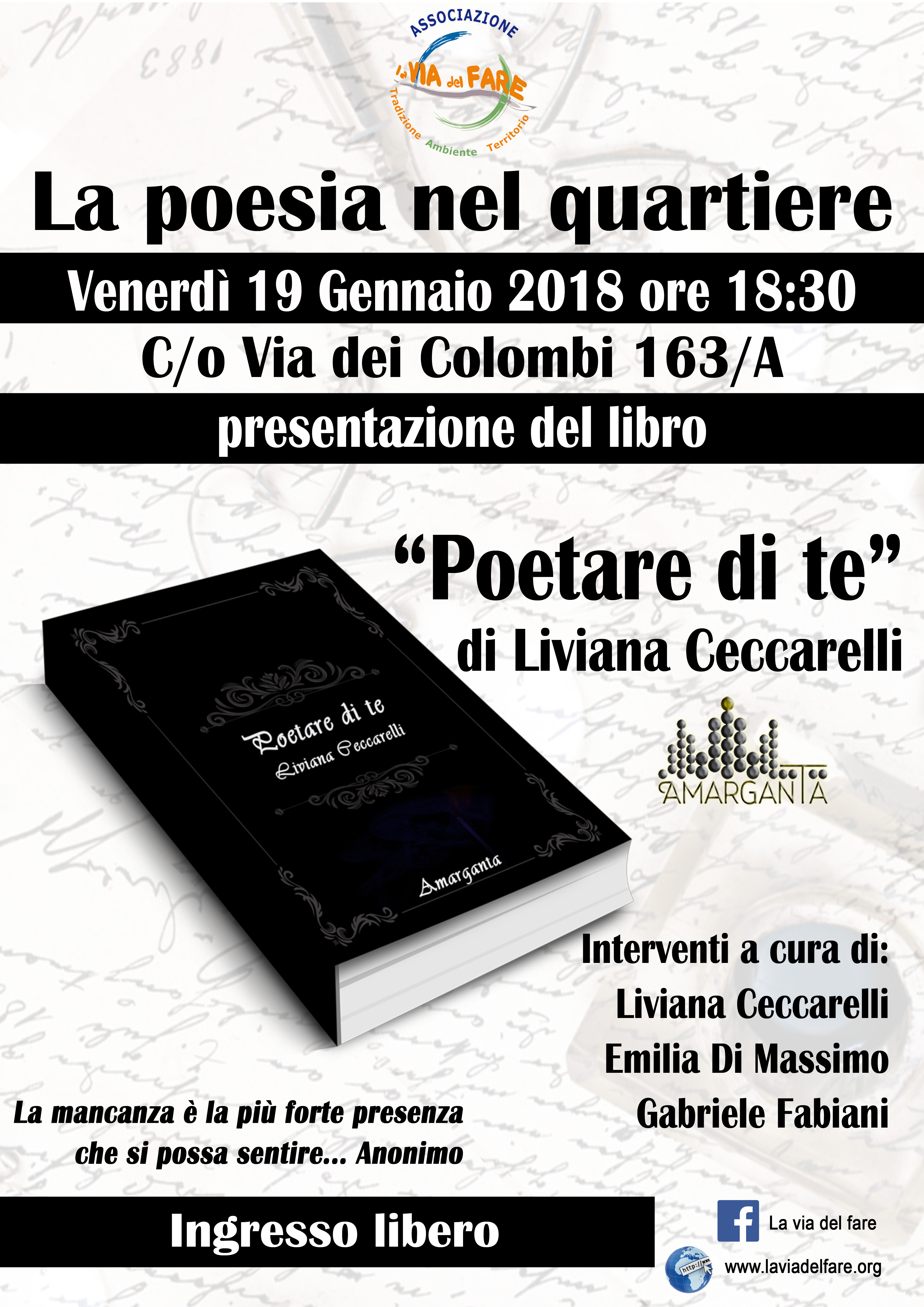 Sarà presentato venerdì 19 Gennaio 2018 alle 18.30, presso la nostra associazione “La Via del Fare” in via dei Colombi 163/A, il libro dal titolo “Poetare di te” scritto da Liviana Ceccarelli ed edito da Amarganta. L’incontro sarà presieduto dall’autrice Liviana Ceccarelli, da Emilia Di Massimo e da Gabriele Fabiani nelle vesti di moderatore.