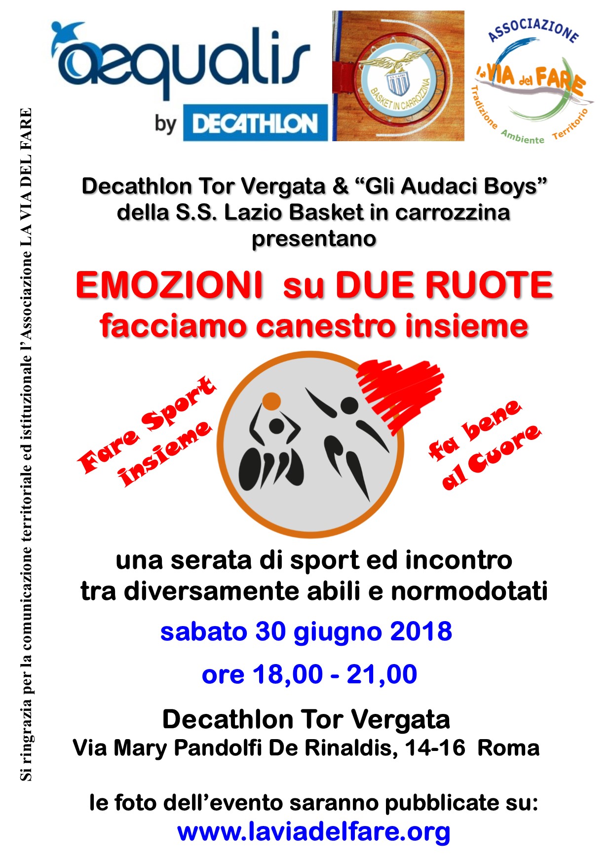 Aequalis by Decathlon & gli Audaci Boys della S.S. Lazio BIC, insieme all’Associazione “La Via del Fare”, scendono insieme in campo per costruire un bel momento di festa ed integrazione sportiva, che è stato chiamato “EMOZIONI SU DUE RUOTE: FACCIAMO UN CANESTRO INSIEME”, per far conoscere, in particolare al territorio del VI Municipio, la bella realtà di sport integrato che parteciperà al prossimo “Campionato Italiano Giovanile” in questo versante di Roma sud-est.