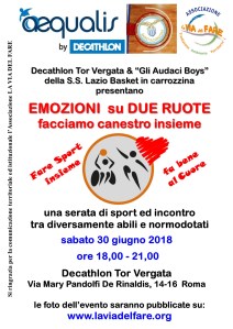 Sabato 30 giugno 2018, dalle ore 18:00 alle 21:00 presso il campo di basket della sede “Decathlon Tor Vergata”, in via Mary Pandolfi De Rinaldis n. 14-16, si svolgerà una serata evento di sport tra i diversamente abili e normododati, una vera dimostrazione di sport integrato, grazie alla collaborazione e disponibilità di “Aequalis by Decathon” .