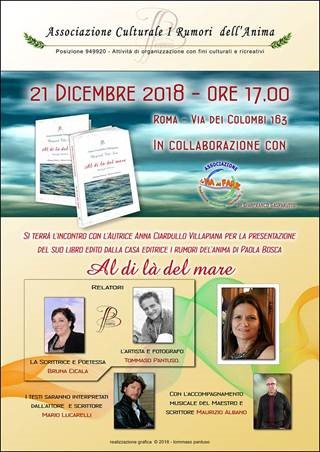 Venerdì 21 dicembre 2018 alle ore 17.00, presso la nostra associazione in via dei Colombi, Anna Ciardullo presenterà il suo libro di poesie “Al di là del mare”, edito dall’Associazione culturale no-profit con servizi editoriali “I rumori dell’Anima“.