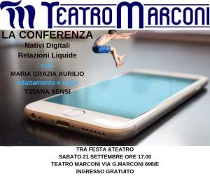 Maria Grazia Aurilio, psicologa ed amica della nostra associazione che abbiamo incontrato in alcuni eventi in sede e che ha lavorato per anni e con passione nel territorio del Municipio VI, ci invita ad un evento “tra festa e teatro” ad ingresso libero e gratuito di cui sarà prossima protagonista, sabato 21 settembre alle ore 17, presso il Teatro Marconi di Roma (V.le Marconi, 698/E): NATIVI DIGITALI, RELAZIONI LIQUIDE.
