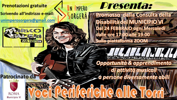 “La Via del Fare” è felice di poter dare il proprio contributo nel diffondere a tutte le famiglie con ragazzi diversamente abili, l’innovativo e utile progetto ad accesso gratuito con prenotazione, “VOCI PERIFERICHE alle TORRI” ideato dall’Associazione “UIS Un Impero Sorgerà – APS” e dalla Band musicale “Mirko Valeri & I Via Greve”, con il Patrocinio di Roma Capitale Municipio VI e promossa dalla “Consulta sui Diritti delle Persone con Disabilità e delle loro famiglie” dello stesso Municipio VI.