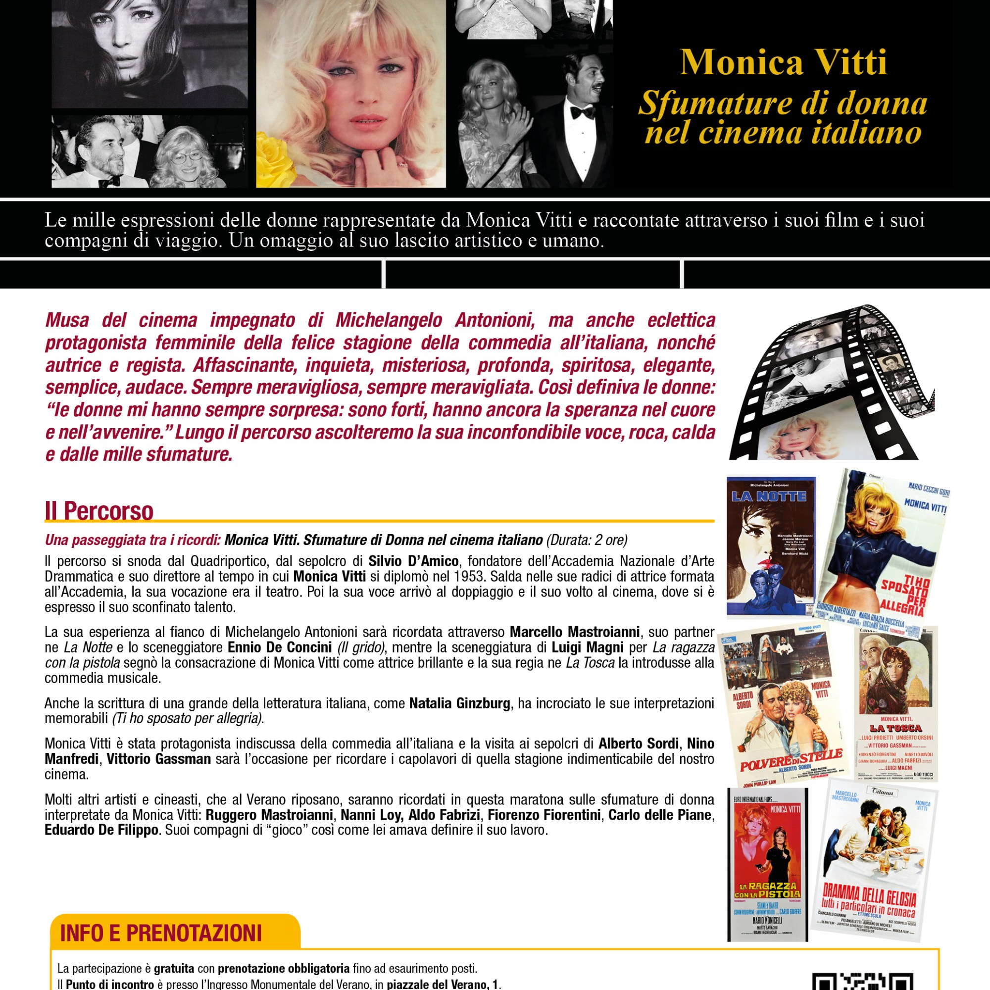 Il programma si inaugura con la visita speciale in omaggio a Monica Vitti che questo anno ci ha lasciati “Monica Vitti. Sfumature di Donna nel cinema italiano” (sabato 28 e domenica 29 maggio), in cui le mille espressioni delle donne rappresentate dall’attrice verranno raccontate attraverso i suoi film e i suoi compagni di viaggio (saranno visitati anche i sepolcri di Mastroianni, Sordi, Manfredi, Magni, Gassman e tanti altri).