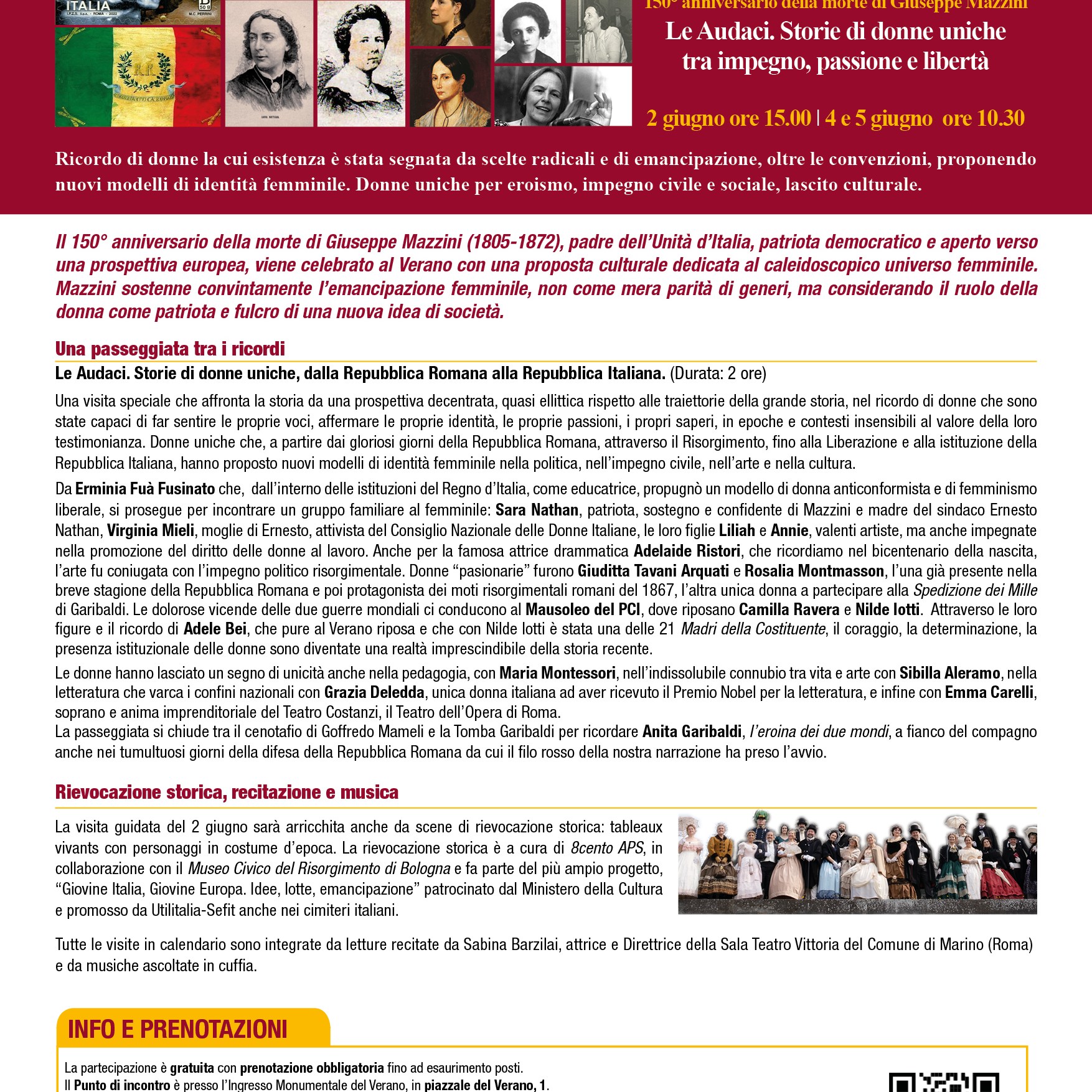 Il 2 giugno si celebra la Festa della Repubblica al Verano con l’itinerario speciale “Le Audaci. Storie di donne uniche dalla Repubblica Romana alla Repubblica Italiana”, un omaggio a Giuseppe Mazzini, per il 150° anniversario della morte dedicato al caleidoscopico universo femminile (repliche il 4 e 5 giugno).Nel ricordo di donne uniche che, a partire dai valori mazziniani e dai gloriosi giorni della Repubblica Romana, attraverso il Risorgimento, fino alla Liberazione e alla istituzione della Repubblica Italiana, hanno proposto nuovi modelli di identità femminile nella politica, nell’impegno civile, nell’arte e nella cultura. Erminia Fuà Fusinato, Sara Nathan, Giuditta Tavani Arquati, Rosalia Montmasson, fino a giungere come un filo rosso all’unicità di donne come Camilla Ravera e a due delle 21 Madri della Costituente Nilde Iotti e Adele Bei. Donne che hanno lasciato un segno di unicità come Maria Montessori, Sibilla Aleramo, Grazia Deledda, Emma Carelli. Donne Uniche la cui esistenza è stata segnata da scelte radicali e di emancipazione, oltre le convenzioni, proponendo nuovi modelli di identità femminile.