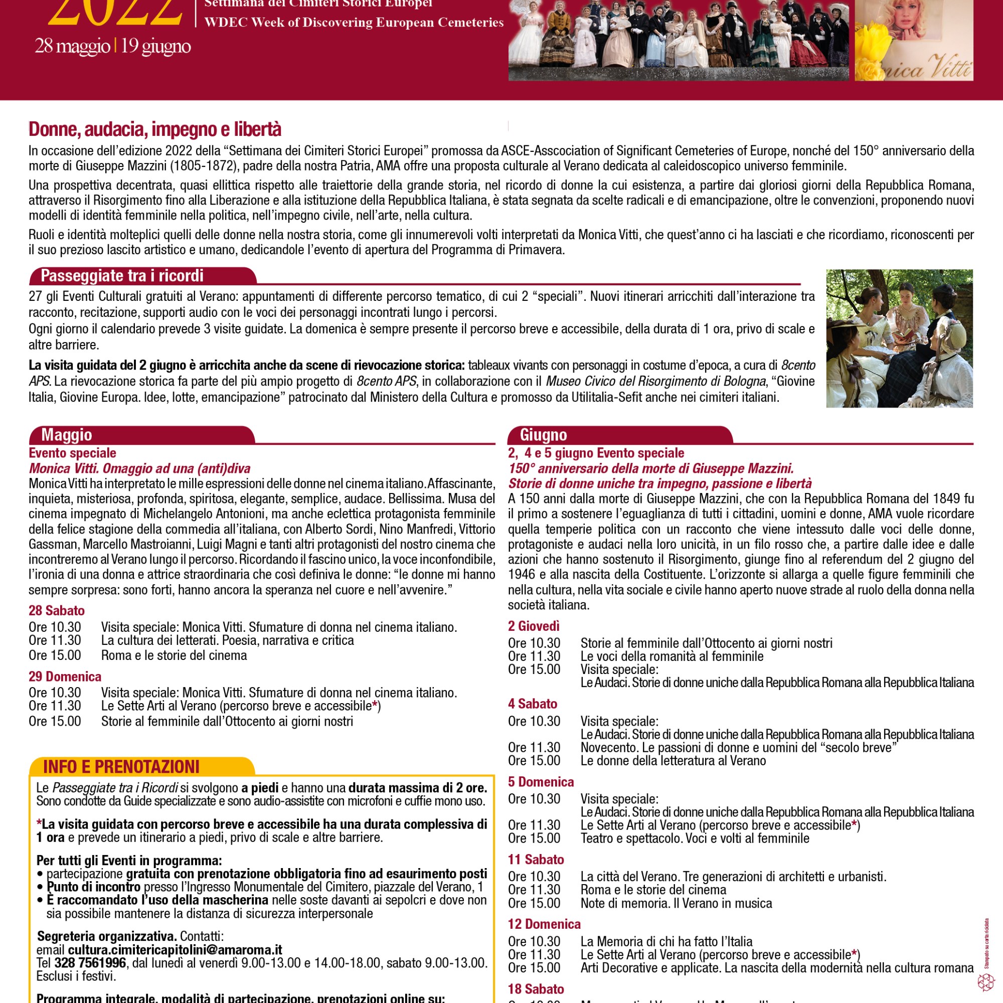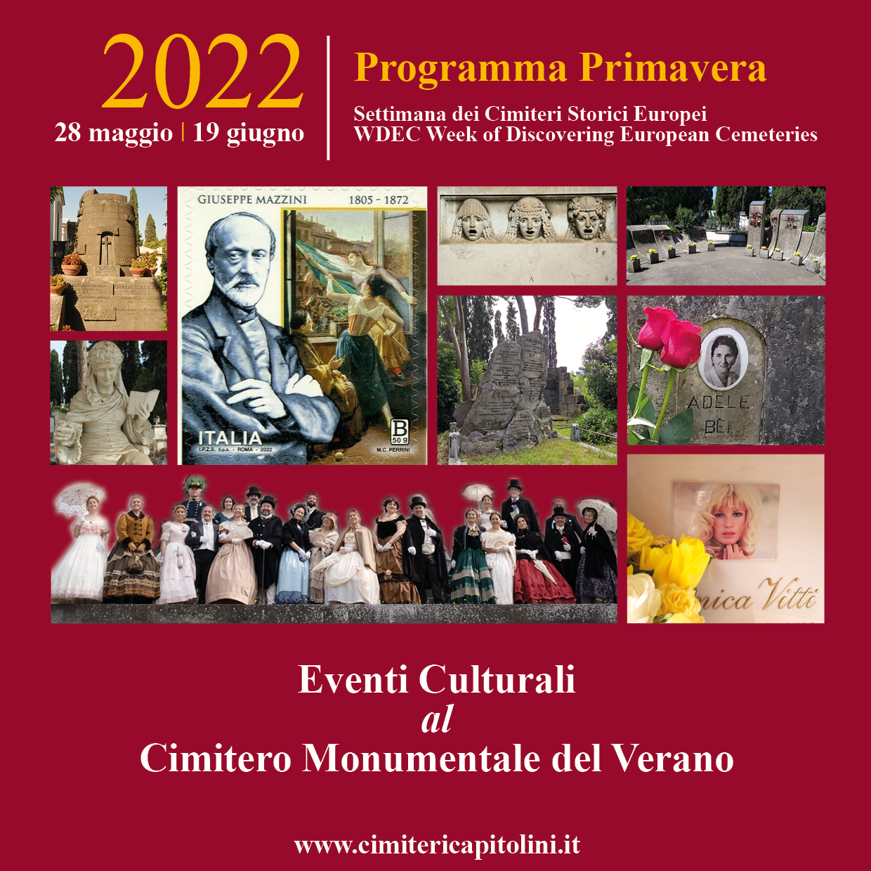 In occasione della edizione 2022 della “Settimana dei Cimiteri Storici Europei” promossa da ASCE(Asscociation of Significant Cemeteries of Europe), nonché del 150° anniversario della morte di Giuseppe Mazzini (1805-1872), AMA, in collaborazione con Roma Capitale e il Municipio II, offre un ricco programma di iniziative culturali gratuite che si svolgeranno al Verano per tre settimane a partire dal 28 maggio. Sono 27 gli eventi culturali gratuiti in programma, appuntamenti di differente percorso tematico, di cui 2 “speciali”, articolati in 9 giornate.