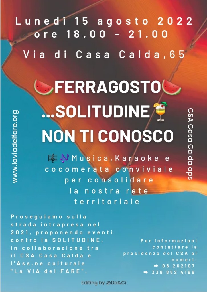 Seguendo il nostro spirito di collaborazione, sempre rivolto in primo luogo a consolidare i rapporti territoriali ed a valorizzarli quanto più possibile, ci rende felici poter unirci alla proposta formulata col Presidente del C.S.A. Casa Calda a.p.s., Italo Della Guardia, per poter offrire ai cittadini ed agli anziani rimasti in città, un pomeriggio di convivialità ed allegria anche ed ancor di più nel giorno di Ferragosto.