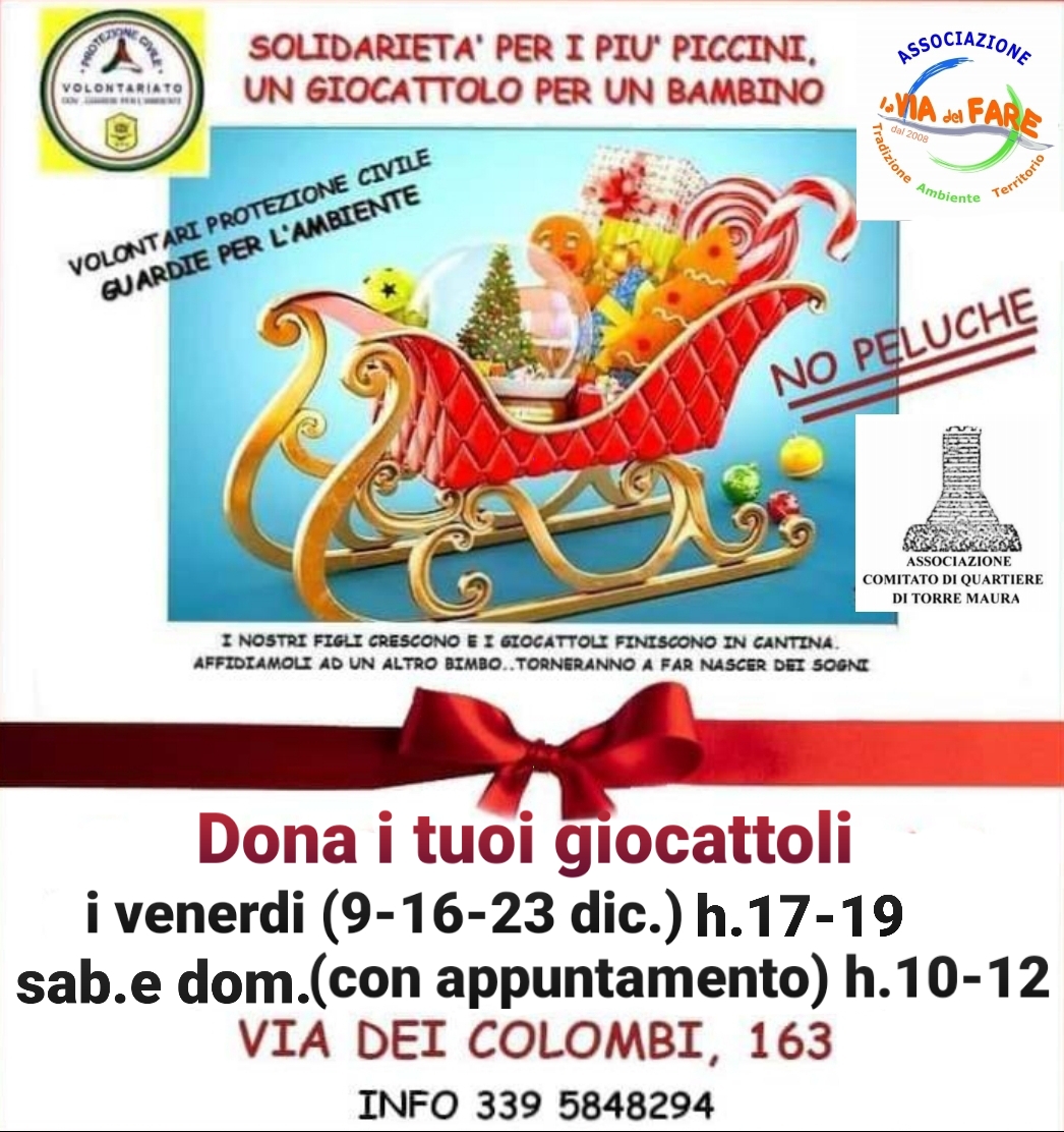 Per questo siamo lieti anche quest’anno di mettere a disposizione la nostra sede, in collaborazione con il Comitato di Quartiere di Torre Maura, per la raccolta dei giocattoli nuovi od usati in buone condizioni, che saranno destinati insieme ai volontari delle “GUARDIE per l’AMBIENTE Protezione Civile” a molte realtà territoriali romane che ne hanno bisogno.