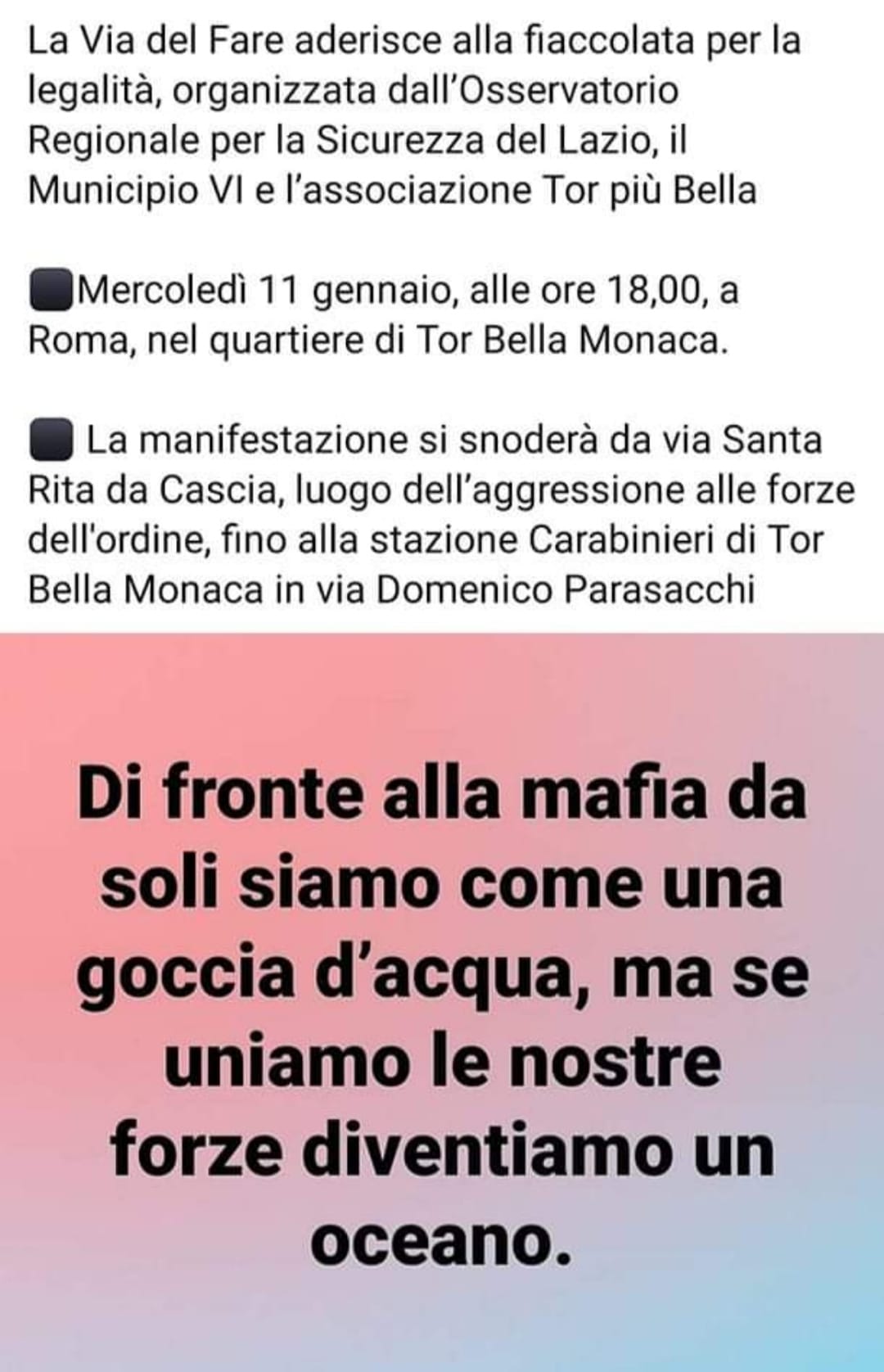11 gen 2023, Tor Bella Monaca, Eoma, Municipio VI – Una serata che ha visto protagonista un vero fiume di gente, giunto a Tor bella Monaca come sospinto dall’energia pulita della corrente dei veri valori umani e che ha mostrato la vera immagine della maggioranza degli abitanti del quartiere di Tor Bella Monaca, che sono arrivati fino alla stazione Carabinieri per dare solidarietà alle forze dell’ordine gravemente aggredite nei giorni scorsi.
