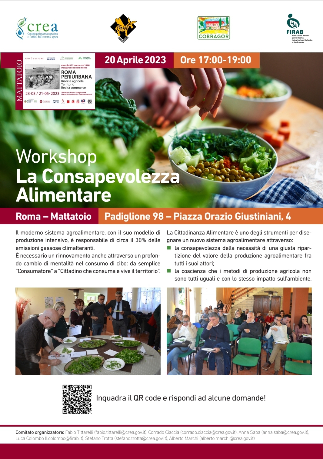 Siamo lieti di condividere con tutti voi l’esclusivo invito ricevuto per il prossimo 20 aprile alle h.17, al workshop sulla “CONSAPEVOLEZZA ALIMENTARE” che si terrà in presenza, presso il pad.98 dell’ex Mattatoio, in Piazza O.Giustiniani n.4, ad ingresso libero e gratuito, fino ad esaurimento posti disponibili.L’evento è organizzato da CREA e FIRAB e con la partecipazione di CoBrAgOr e Cooperativa Coraggio.