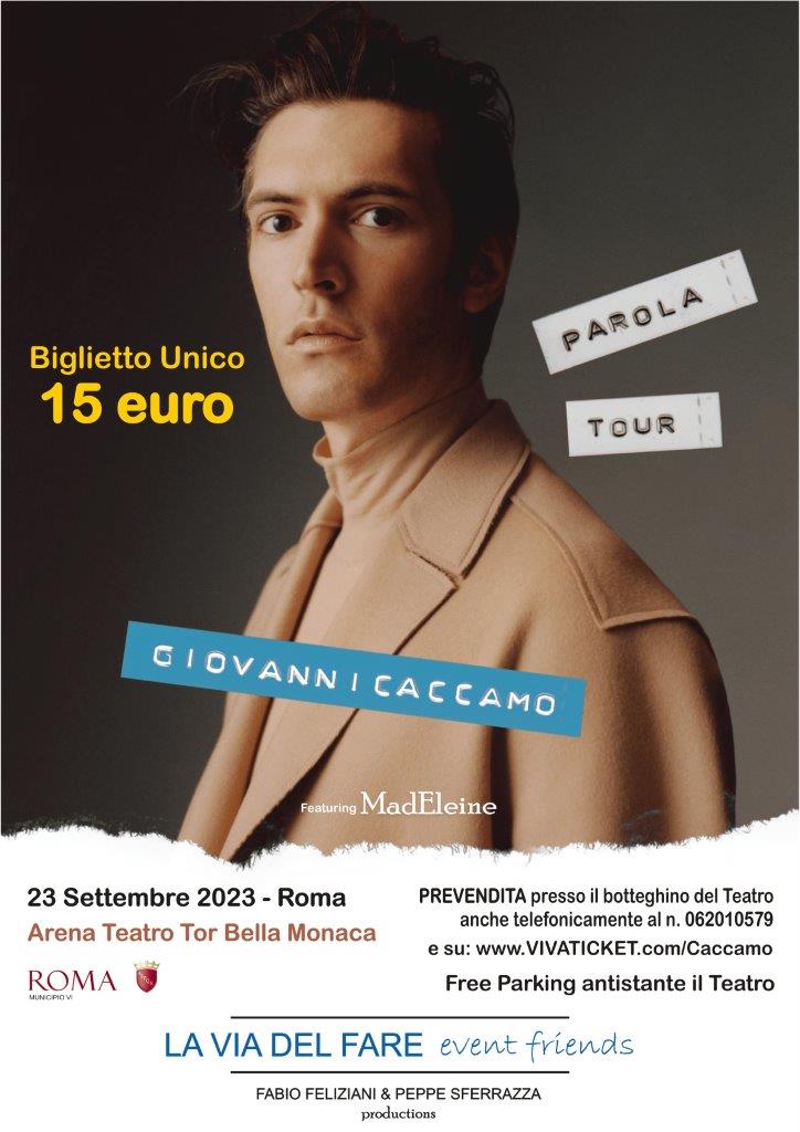 Questo evento chiuderà la grande stagione estiva all’Arena del Teatro di Tor Bella Monaca e saràuna tappa importante del “Parola Tour”, un percorso decisamente ricco di date che ha permesso a Caccamo di fare il giro del Mondo, conducendolo fino in Cina. Un viaggio a tappe che racchiude in sé, quell’idea di instaurare con il pubblico un cammino creativo, emotivo e culturale, lasciando alla fine del concerto, un profondo senso di pienezza emotiva.