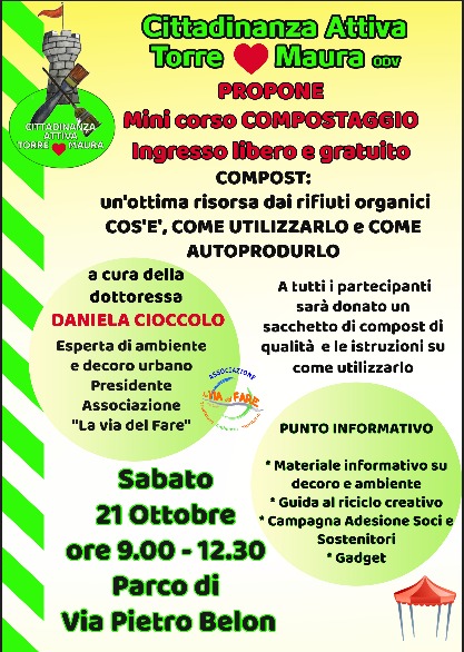 Il corso dal titolo “COMPOST: UN’OTTIMA RISORSA DAI RIFIUTI ORGANICI. COS’E’, COME UTILIZZARLO E COME AUTOPRODURLO” sarà tenuto dalla dott.ssa Daniela Cioccolo, esperta d’ambiente e presidente dell’Ass.ne “La Via del Fare – Tradizione, Ambiente e Territorio”.