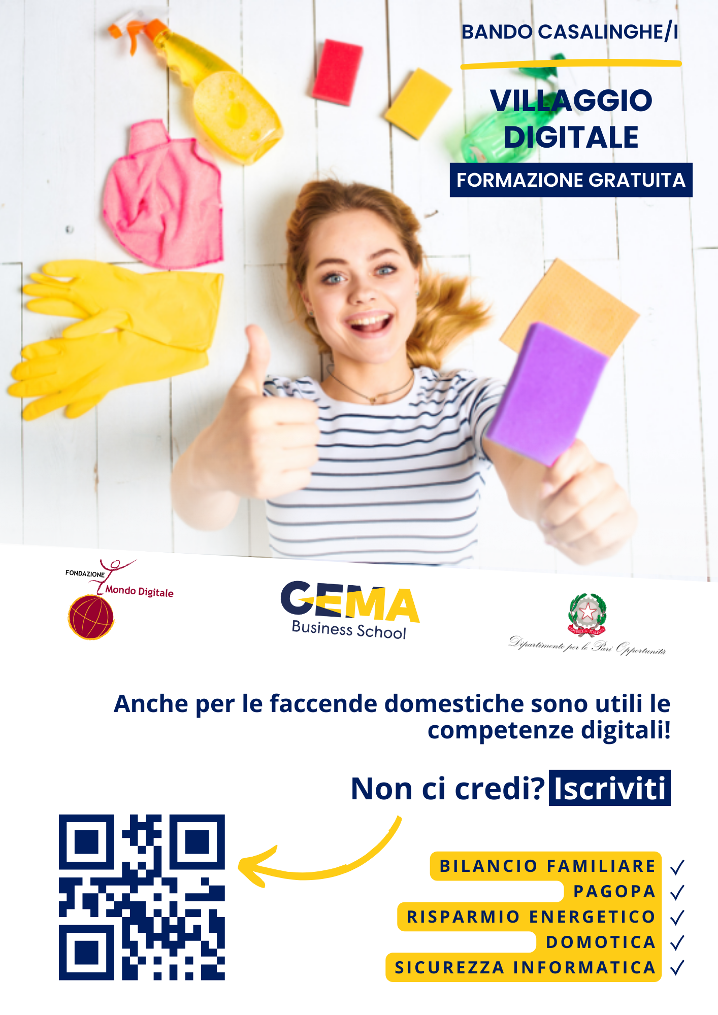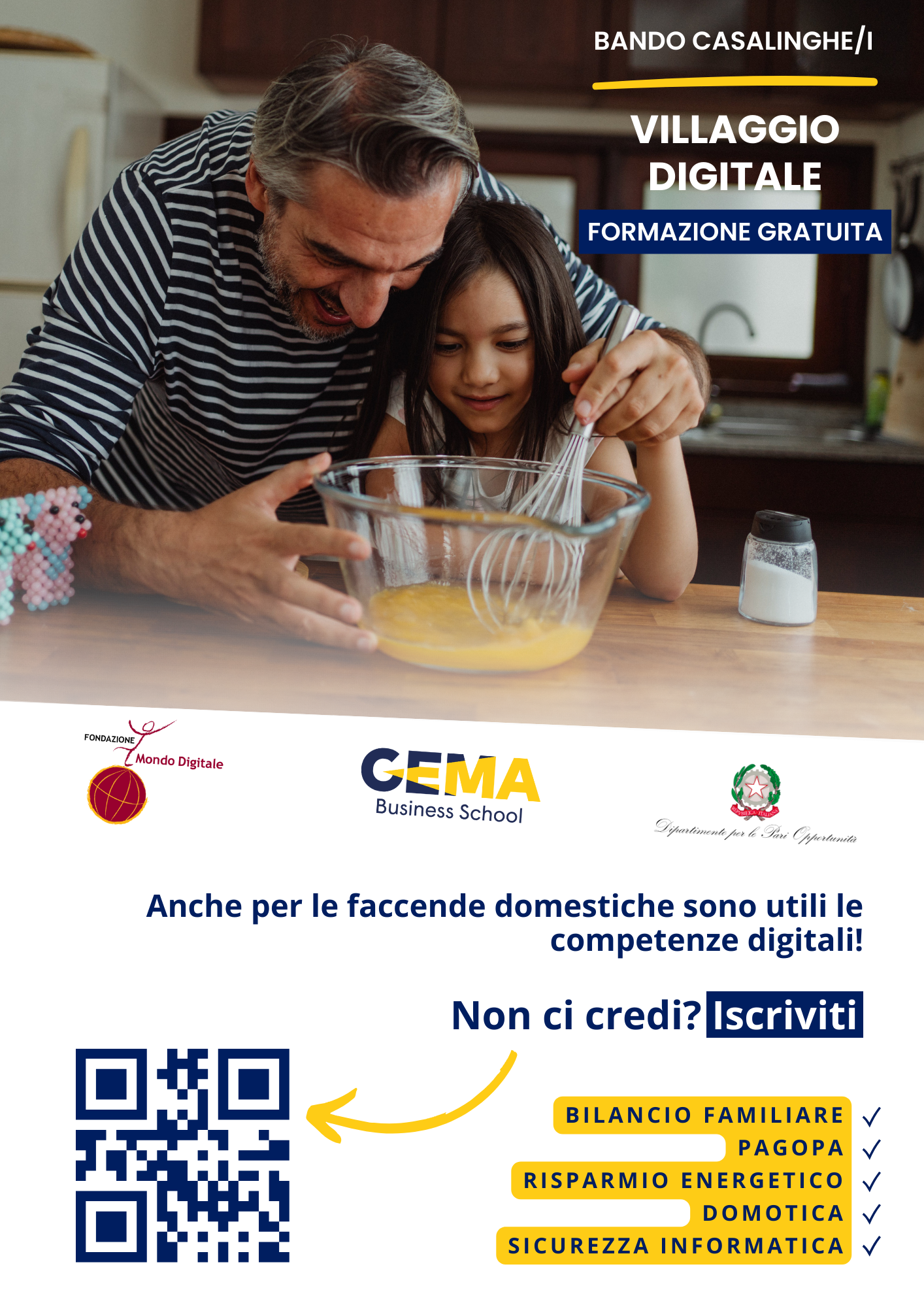 Siamo felici di annunciare il lancio del progetto “Villaggio Digitale”, in collaborazione con GEMA Business School e con il Dipartimento delle pari opportunità della Presidenza del Consiglio, un percorso formativo dedicato all’alfabetizzazione digitale di persone che si occupano della cura della famiglia e dell’ambiente in cui dimorano.