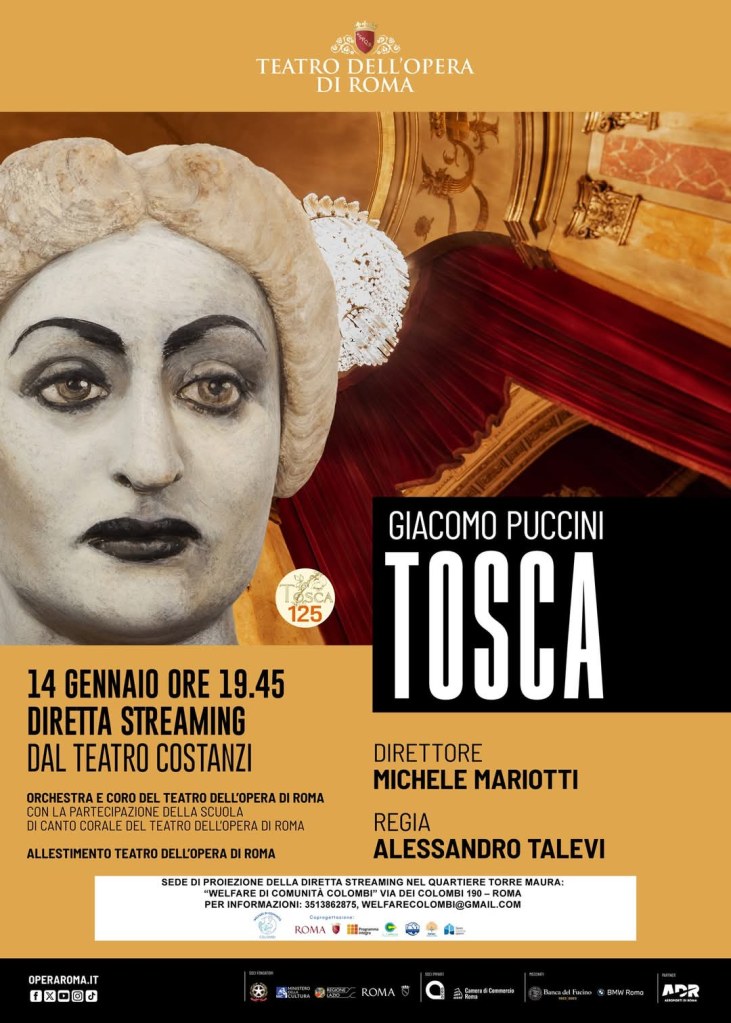 Nel giorno del 125° compleanno dal debutto, in collaborazione con il Teatro dell’Opera di Roma, la Tosca sarà diffusa in diretta streaming in alcuni luoghi simbolici della città, tra cui il centro di Torre Maura.