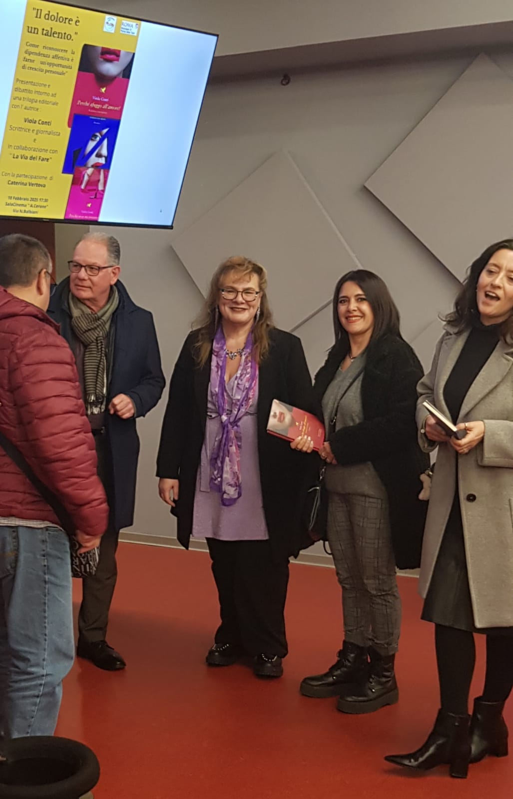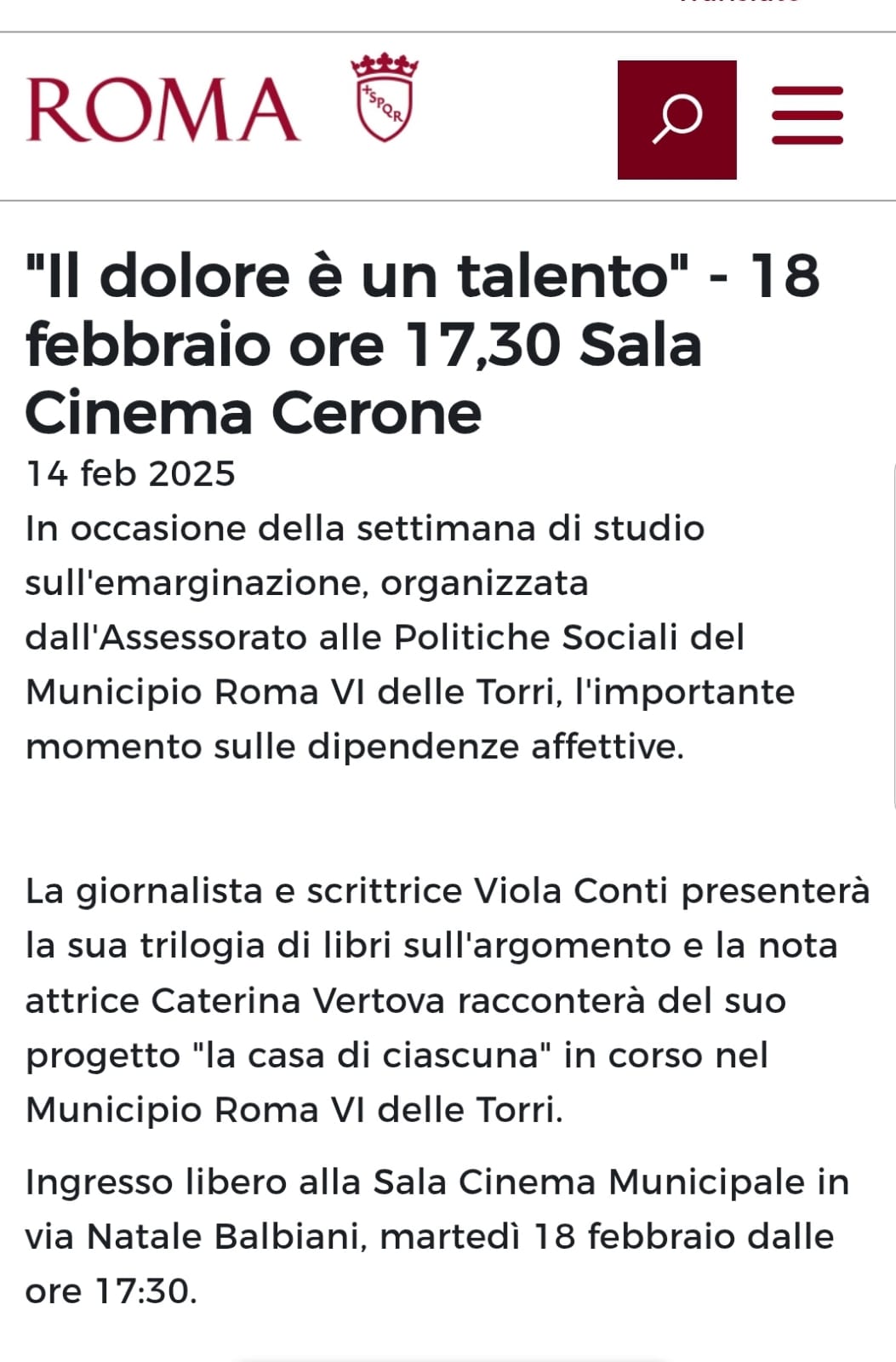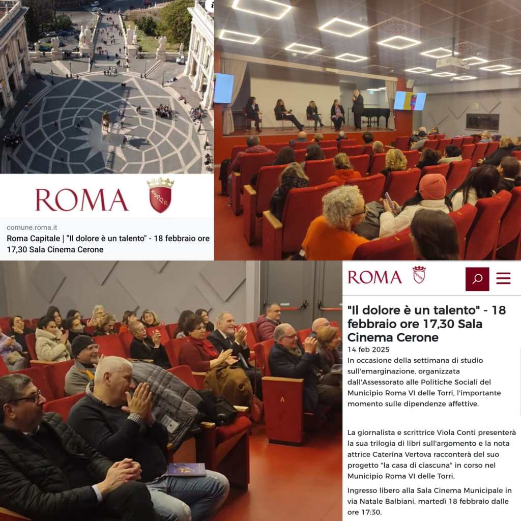 18 febbraio 2025 📚 In occasione della settimana dedicata al tema dell’Emarginazione, sono molto contenta di essere stata coinvolta dal Municipio VI Roma delle Torri, in un dibattito sul tema della Dipendenza Affettiva, insieme a Daniela Cioccolo, presidente dell’associazione LA VIA DEL FARE, Sabrina Zolla, presidente dell’associazione ALGAXIA ed all’attrice Caterina Vertova, ideatrice del laboratorio teatrale “LA CASA DI CIASCUNA”, che ha letto degli estratti del mio ultimo romanzo “ Perché non mi innamoro ?” e si è resa disponibile, con grande sensibilità, ad ulteriori future collaborazioni.
