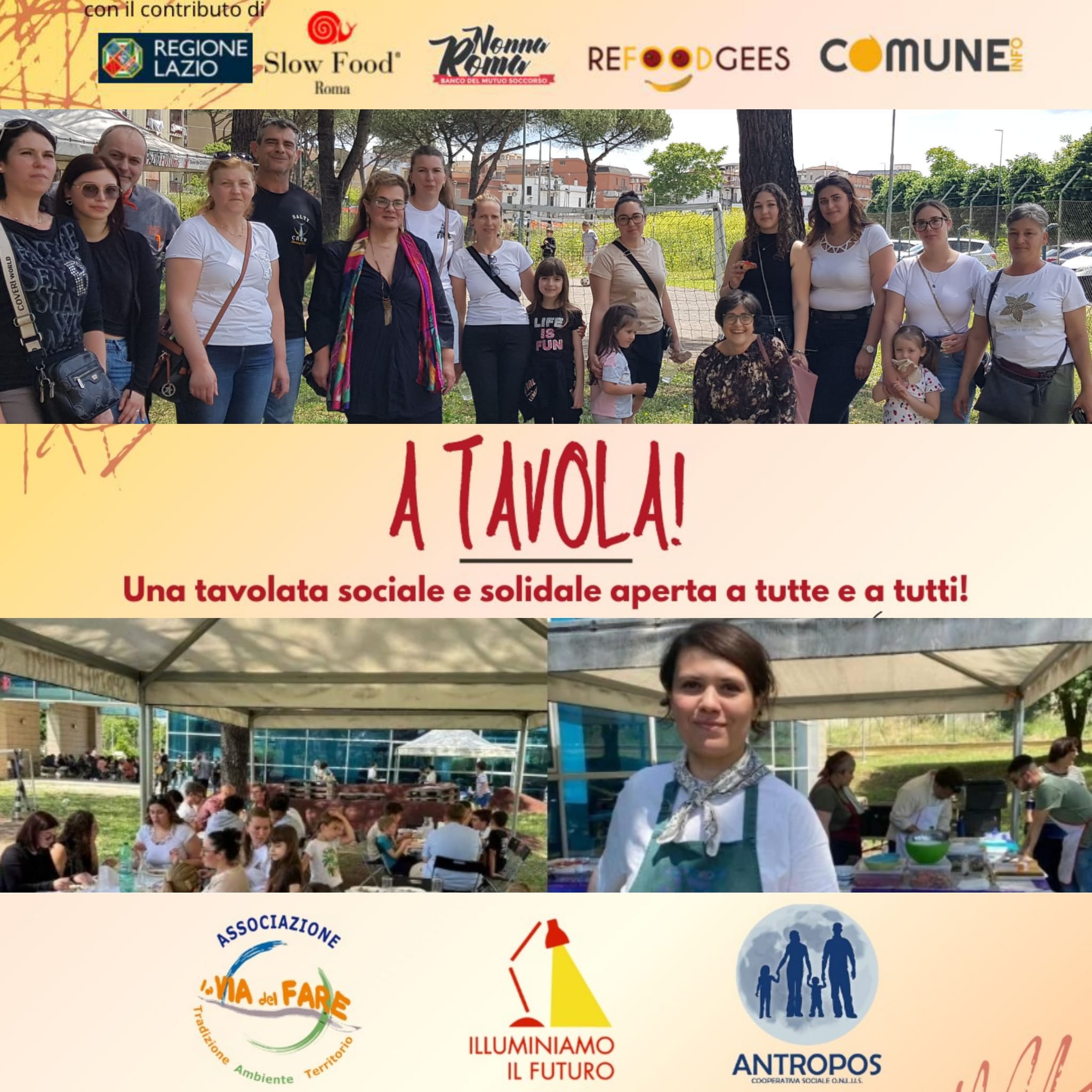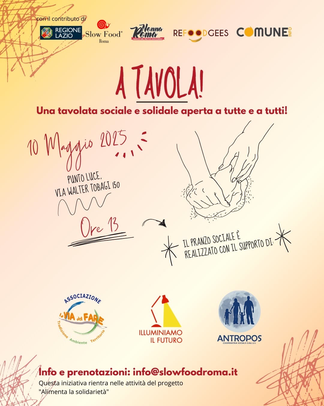 Unisciti a noi anche per questo momento sociale e condiviso. Il 10 maggio ci ritroviamo a tavola per un grande pranzo solidale insieme alle persone più fragili, supportate da Nonna Roma.