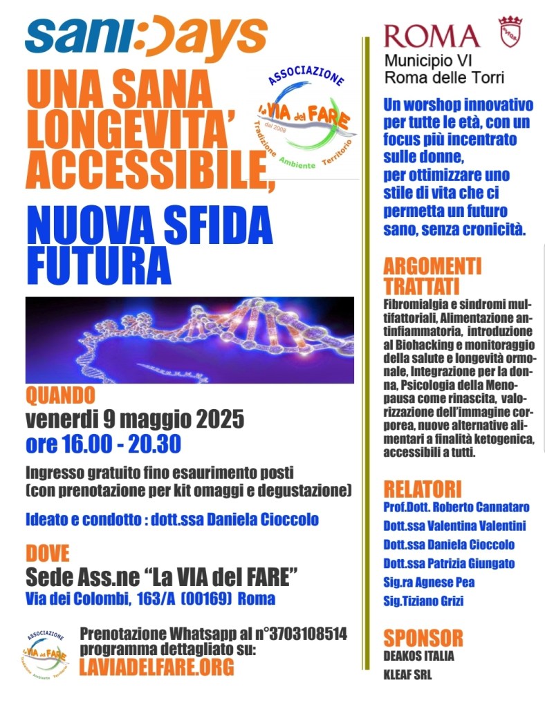 Un evento ideato dall’associazione @laviadelfare, arricchito di workshops esperienziali, incentrati sulla Salute, Benessere e sana Longevità accessibile a tutti, offrendo un focus innovativo sulla promozione di stili di vita più sani e longevi, nonostante alcune fragilità e criticità del mondo femminile. Il confronto con gli esperti sarà incentrato sull’Alimentazione antinfiammatoria, sul trattamento della Fibromialgia e delle sindromi multifattoriali, sull’introduzione al Biohacking e nuovi fattori da monitorare, per ottimizzare la salute e la longevità ormonale, sulla Psicologia della Menopausa come rinascita, sulla Valorizzazione della propria immagine, sulla scoperta di nuove alternative alimentari a finalità ketogenica, partecipando sempre gratuitamente per chi si prenota, ad una degustazione finale della KLEAF SRL e ricevendo un kit DEAKOS Italia con degli integratori di nuova generazione più specifici per la salute della donna.