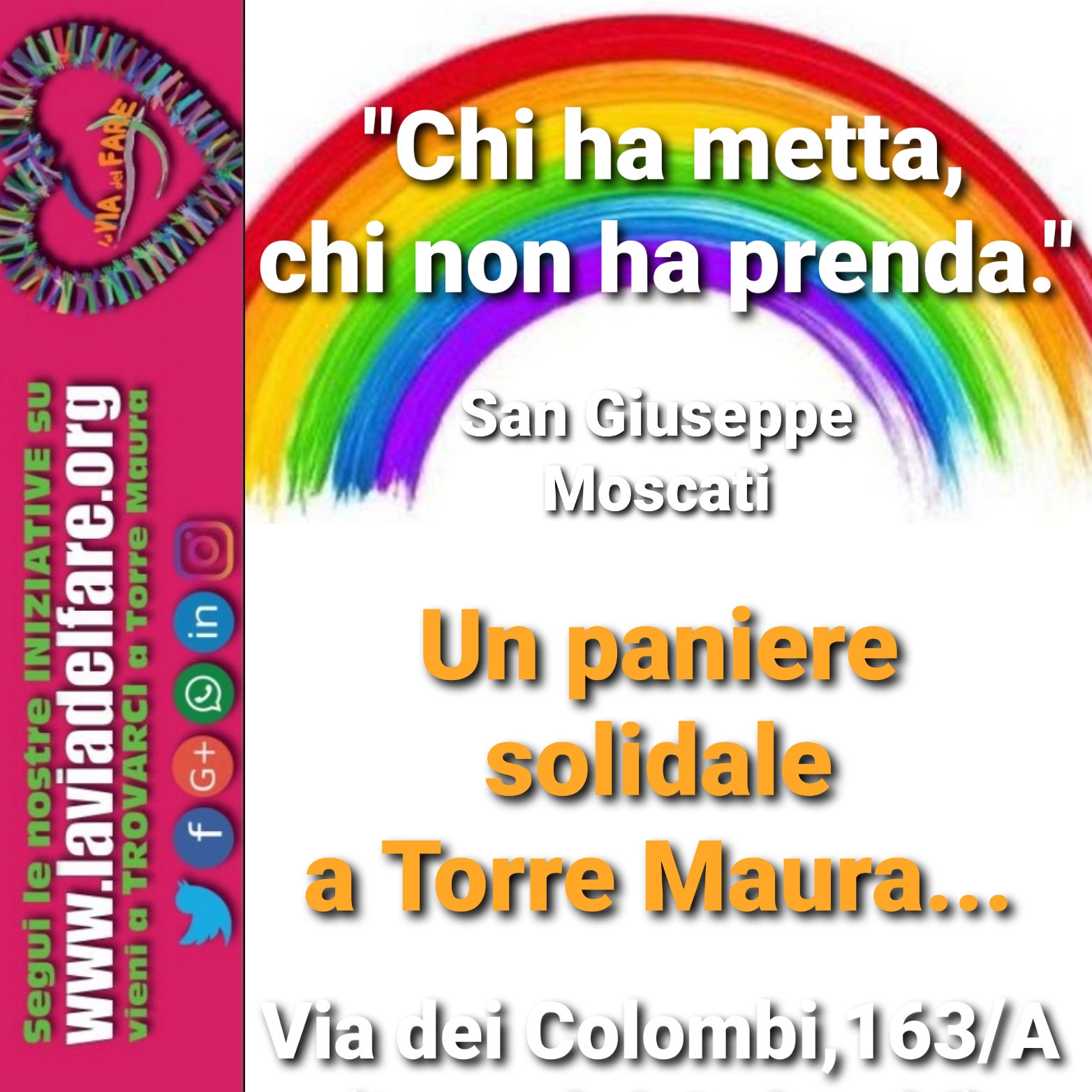 Con questa stessa modalità, da venerdì 3 aprile sarà possibile donare a favore di chi ne ha più bisogno qualsiasi genere alimentare non deperibile od alcuni beni durevoli di prima necessità (pannolini, detergenti per cura della persona), lasciando quello che ognuno può e vuole presso la sede de “La VIA del FARE” di Roma, Torre Maura, Via dei Colombi, 163/A, dove abbiamo predisposto all’esterno, in luogo riparato, il nostro “PANIERE SOLIDALE” con un apposito contenitore, contrassegnato per quest’iniziativa.