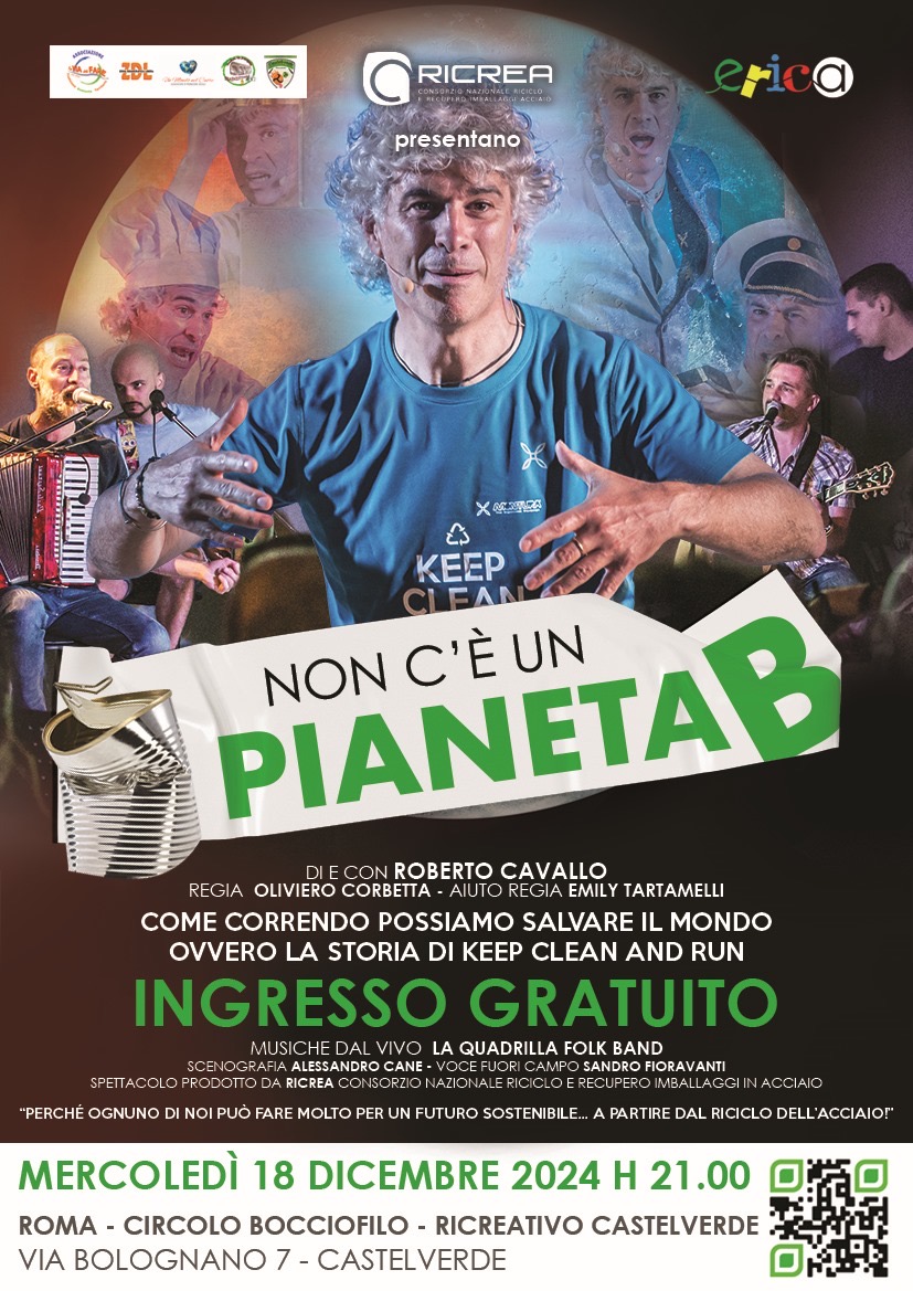 Quasi al termine di questo 2024, in perfetta sinergia con altre Associazioni e realtà del territorio del Municipio VI, con cui abbiamo lavorato per realizzare il progetto, proporremo un nuovo dinamico percorso di Educazione Ambientale a cura di ERICA Comunicazione Ambientale, organizzando nella periferia est di Roma, a Castelverde, una tappa importante della tournée di “NON C’È UN PIANETA B” che è il titolo dell’ultimo nuovo spettacolo teatrale di “ecosostenibilità” contro l’abbandono dei rifiuti, che lo stesso autore ed interprete, Roberto Cavallo, porta in scena grazie al supporto decisivo di RICREA, il Consorzio Nazionale per il Riciclo e il Recupero degli Imballaggi in Acciaio.